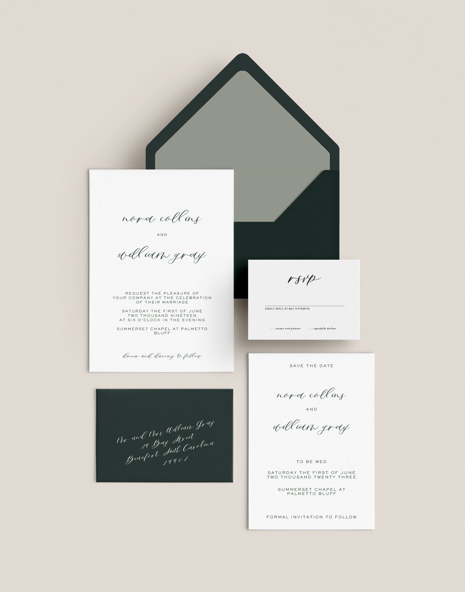 The semi-custom invitation collection features crafted designs that you can customize with your personal style. Each suite starts as a base design that you can customize with personalized wording and ink and envelope colors.